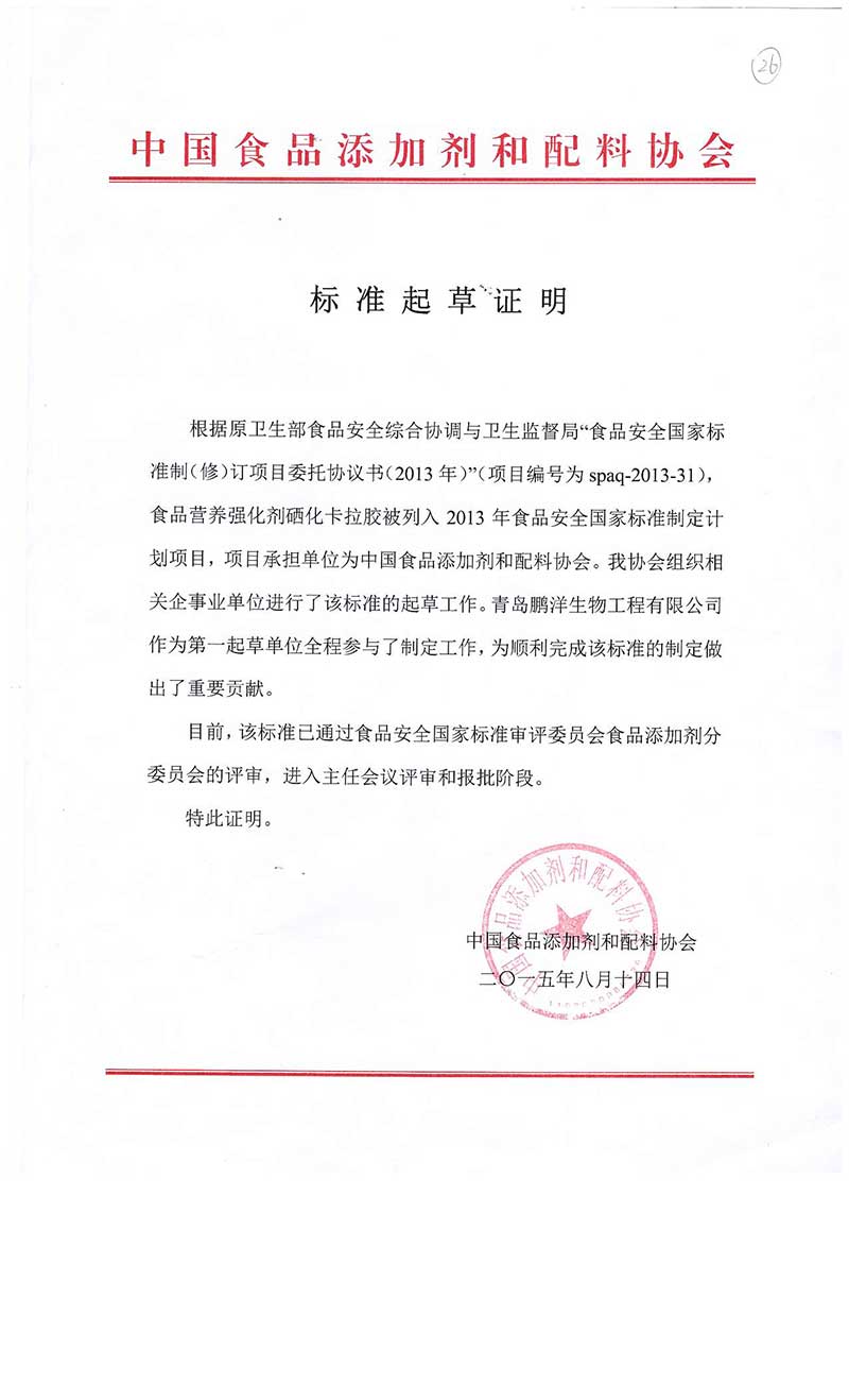 青島鵬洋生物工程有限公司是一家專門從事海洋生物活性物質和新資源食品原料研發、生產、銷售的高新技術企業。公司依托科研院所、高校,以及自身強大的研發實力不斷創新,獲得多項國家發明專利和榮譽,是食品安全國家標準《食品安全國家標準 食品營養強化劑 硒化卡拉膠》(GB 1903.23-2016)的起草單位、中國食品添加劑和配料協會會員單位...詳情